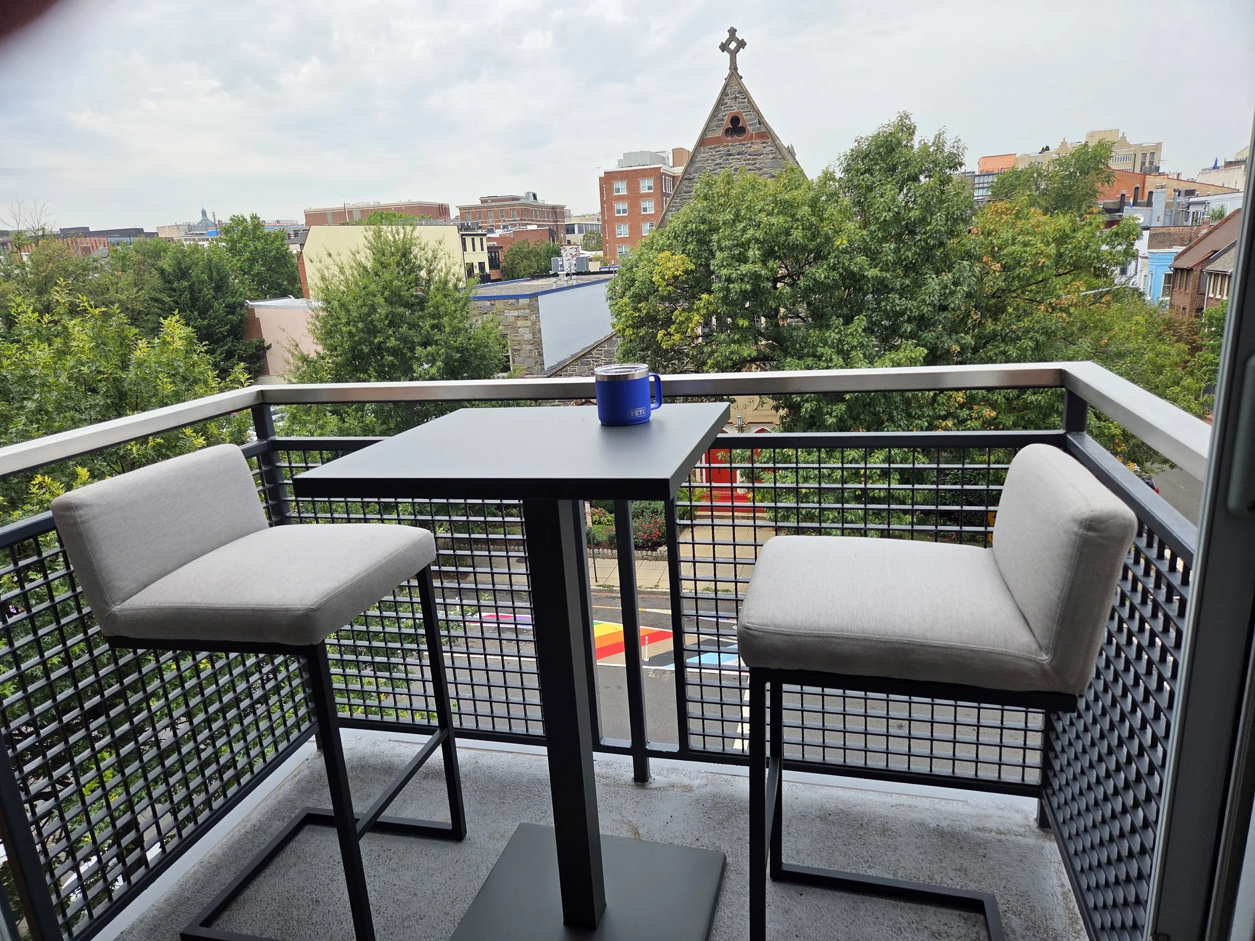 Breakfast on the balcony. If I sit in the chair on the right, I look into my next-door-neighbor’s living room. His dog, a big shaggy guy, is none too thrilled with this new human invading his airspace. There is much barking. Eventually his owner comes to calm him down. I wave at my neighbor, whom I haven’t met yet; the dog puts his forepaws on the guy’s shoulders and is content.